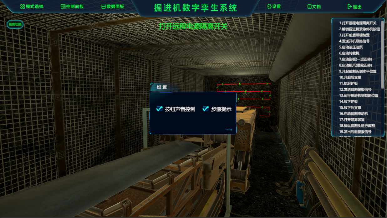 為操作人員和工程師提供虛擬的培訓環境,模擬不同工況和故障場景,提高技能水平和應對能力。“掘進機數字孿生系統”還原井下實際環境,對設備工作原理、動作進行仿真。通過軟硬件的結合,學員可以在掘進機上、控制中心操作臺上模擬操作井下掘進機工作;并且可以在虛擬控制面板上進行掘進流程的操作;